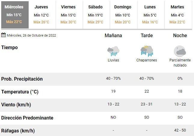 Con lluvias a la mañana y chaparrones a la tarde, el miércoles será una jornada pasada por agua en la ciudad. Así lo pronostica el Servicio Meteorológico Nacional, que además anticipa una temperatura máxima de 22°C, una humedad en torno al 88% y vientos leves a moderados del noreste.