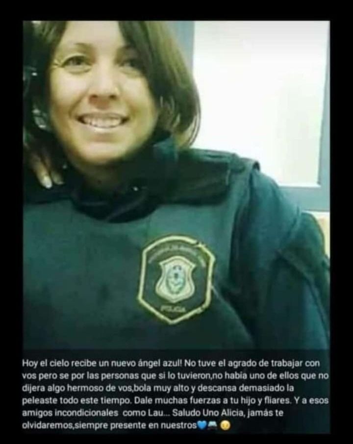 La muerte de Alicia conmocionó a sus allegados y a la fuerza policial en general. "Descansa, ya peleaste demasiado", dice uno de los mensajes que acompaña su foto luciendo el uniforme. "No tuve el agrado de trabajar con vos pero no encuentro a nadie que no diga algo hermoso", completa.