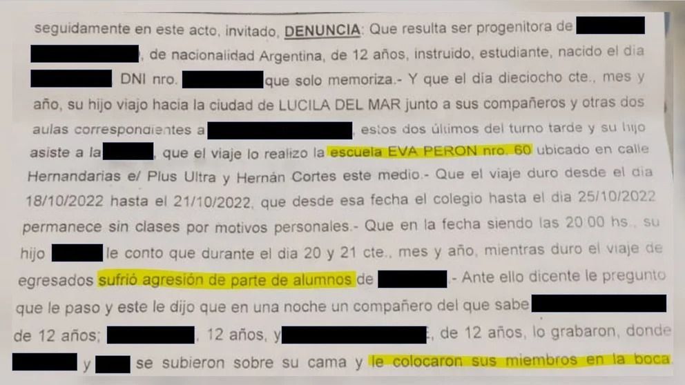 La madre del menor, dio detalles en la denuncia que radicó. Según publica Infobae la mujer dijo: “Mi hijo me contó que mientras duró el viaje sufrió abusos por parte de sus compañeros. Me dijo que una noche, dos compañeros se subieron a la cama y le colocaron su miembro en la boca mientras que otro filmaba con un celular. No fue sólo una vez, fueron varias veces. En otra noche, directamente fueron a golpearlo y se salvó porque otro lo defendió”.