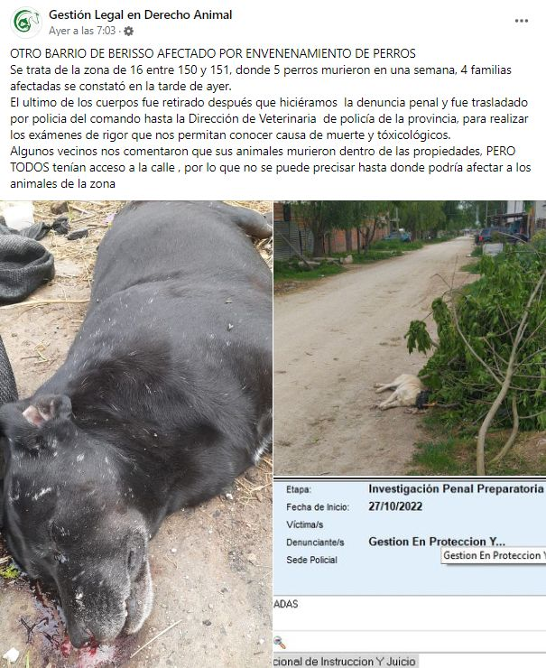 Este episodio sucedió en la zona de 16 entre 150 y 151, y según indicaron desde dicha ONG se radicó la denuncia penal después de haber retirado el último cuerpo que quedó en la calle. Este fue trasladado por la policía hasta la Dirección de Veterinaria "para realizar los exámenes de rigor que nos permitan conocer causa de muerte y toxicológicos".
