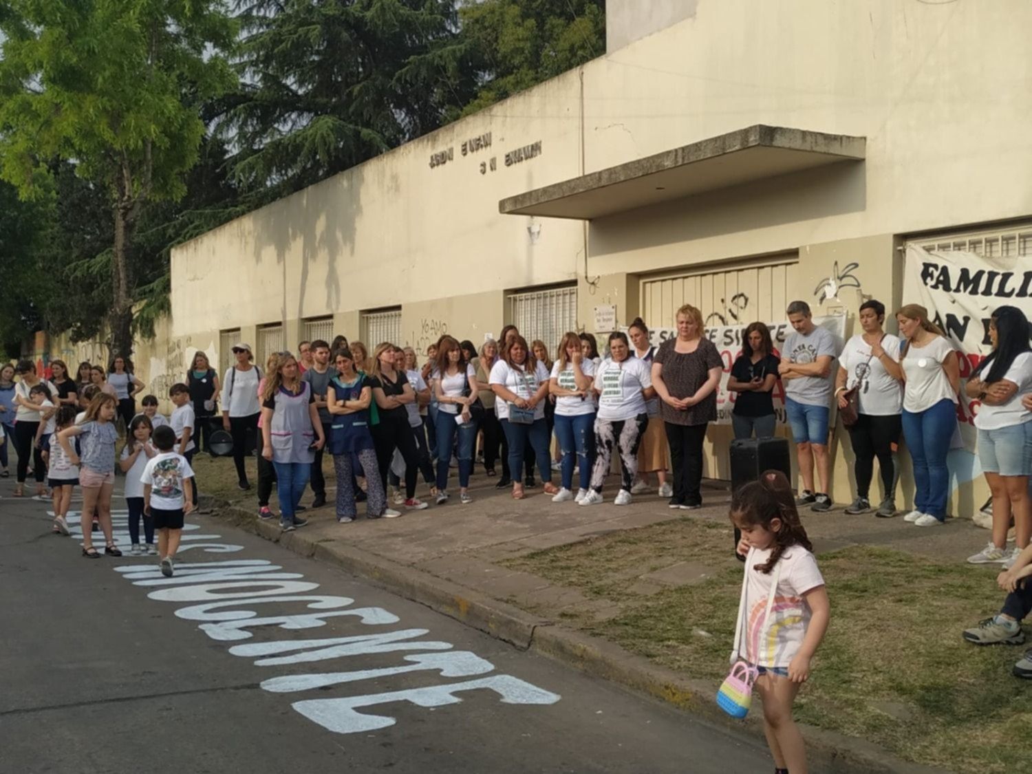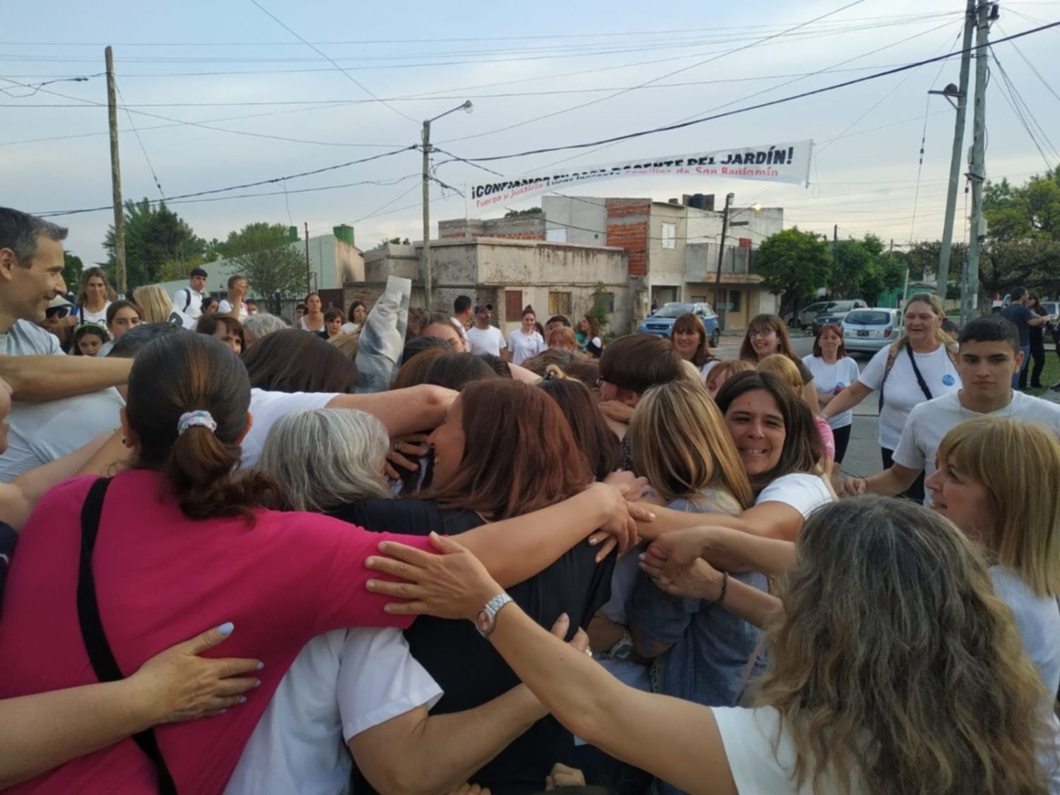 Parte de la comunidad educativa del Jardín San Benjamín de Los Hornos volvió a manifestar en reclamo de la libertad de Lucas Puig, el maestro de música que fue condenado a 35 años de prisión acusado por abusas de dos niños. Esta vez, padres y docentes, acompañados por algunos nenes, hicieron un abrazo al establecimiento ubicado en 57 y 140, se sacaron fotos con carteles reclamando la liberación y repudiando la decisión de la justicia y realizaron pintadas sobre el asfalto.