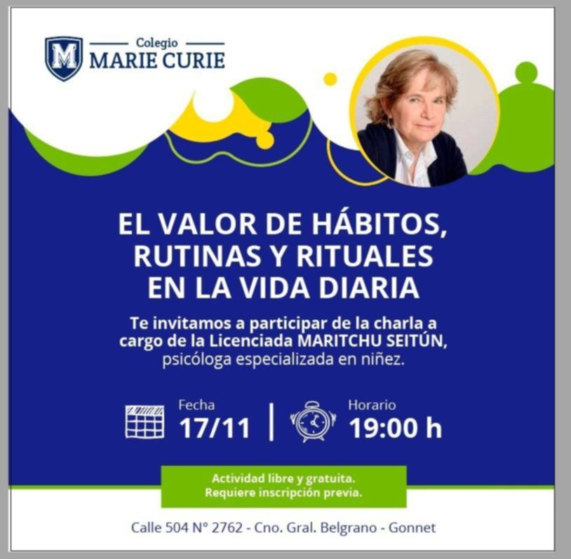 El Colegio Marie Curie realizará una charla sobre niñez y crianza a cargo de la licenciada Maritchu Seitún. Bajo el título "El valor de hábitos, rutinas y rituales en la vida diaria", la institución convocó a la comunidad educativa a participar de la iniciativa, que será el próximo 17 de noviembre a las 19 con entrada libre y gratuita.