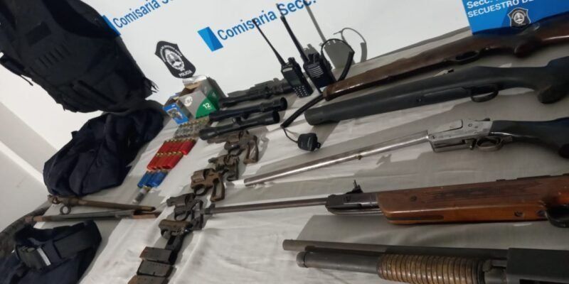 Durante el allanamiento incautaron un chaleco y pantalón policial, cuatro cargadores de pistola, cuatro revólveres diversos, una pistola calibre 22, una escopeta 12/70 Magtech, una carabina calibre 22, una escopeta calibre 16. También se llevaron dos culatas de escopetas, dos equipos de radio-comunicación, tres miras telescópicas, 23 cartuchos calibre 12/70 y calibre 16, tres cartuchos calibre 16.