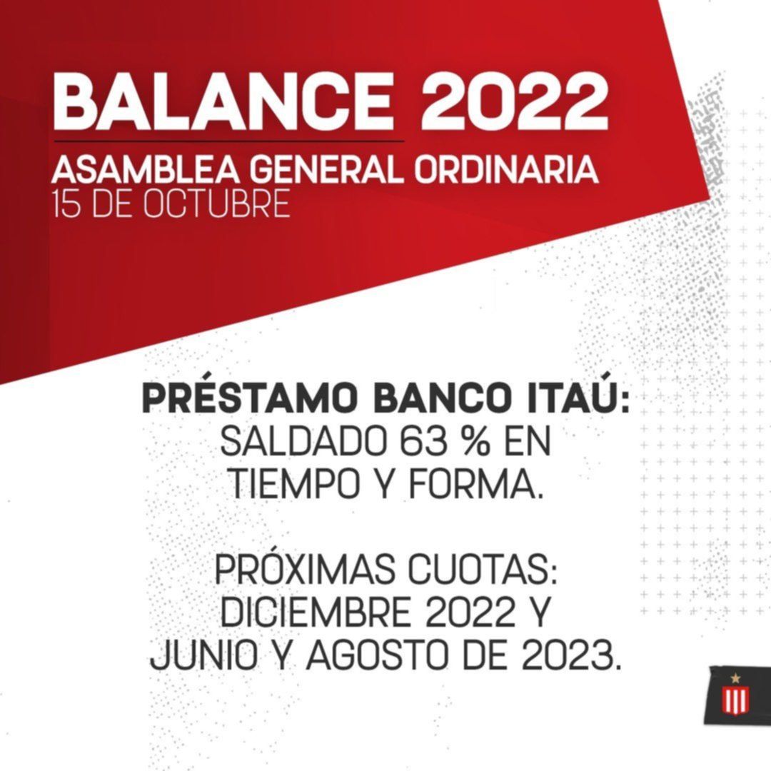 Cabe destacar, que en la Asamblea General Ordinaria se dará a conocer también que la dirigencia presidida por Martín Gorostegui, cierra su balance anual con un superávit de casi 600 millones de pesos, algo muy meritorio y no muy habitual en las finanzas de los clubes de Primera División del fútbol argentino.