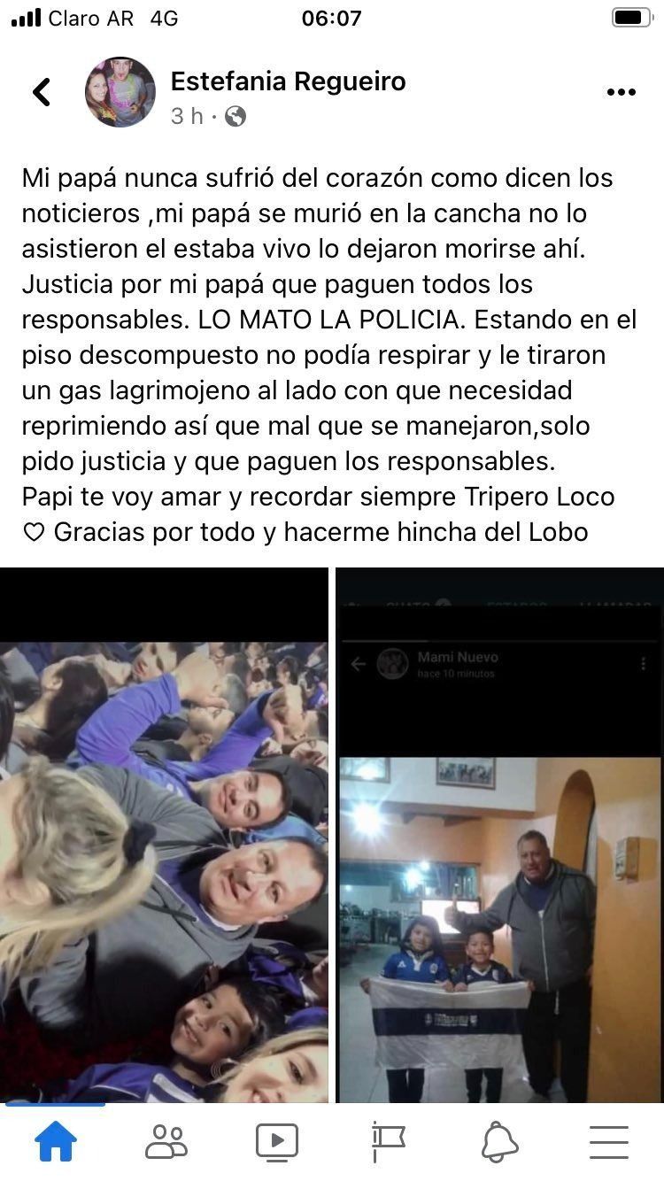 "Mi papá nunca sufrió del corazón como dicen los noticieros, mi papá se murió en la cancha. No lo asistieron, él estaba vivo, lo dejaron morirse ahí. Justicia por mi papá, que paguen todos los responsables", escribió Estefanía Regueiro en su cuenta de Facebook, apenas horas después de la represión que tuvo como saldo, además, ocho heridos de bala y traumatismos.