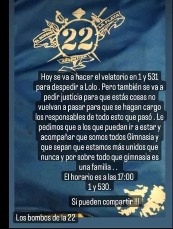 “Hoy se va a hacer el velatorio en 1 y 530 para despedir al Lolo. Pero también se va a pedir justicia para que estas no vuelvan a pasar, para que se hagan cargo los responsables de todo lo que pasó. Le pedimos que a los que puedan ir a estar y acompañar, que somos todos Gimnasia, y sepan que estamos más unidos que nunca y por sobre todo que Gimnasia es una familia”, reza la convocatoria que circuló en el transcurso de la jornada a través de las redes sociales.