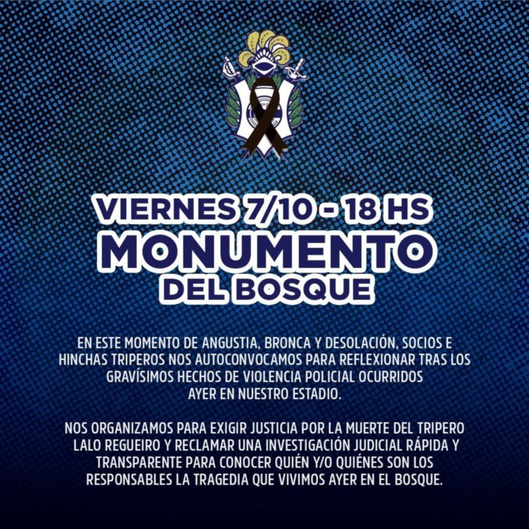 Por su parte, otro grupo de hinchas triperos concentrarán en el monumento del Bosque platense a las 18, para exigir Justicia por los hechos sucedidos en las inmediaciones del estadio. “En este momento de angustia, bronca y desolación, socios e hinchas triperos nos autoconvocamos para reflexionar tras los gravísimos hechos de violencia policial ocurridos ayer en nuestro estadio. Nos organizamos para exigir Justicia por la muerte del tripero Lalo Regueiro y reclamar una investigación judicial rápida y transparente para conocer quién o quiénes son los responsables de la tragedia que vivimos ayer en el Bosque”. señalaron los fanáticos albiazules, que todavía no salen de la conmoción de lo que sufrieron en la noche del jueves durante el encuentro ante Boca.