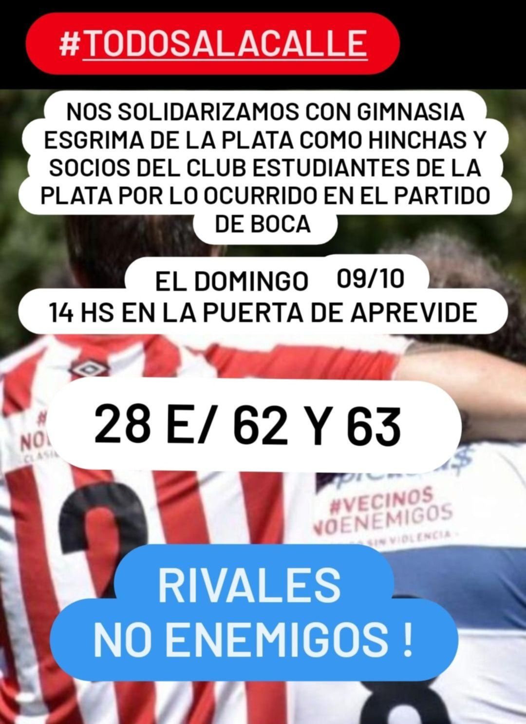 La convocatoria, pautada para este domingo a las 14, había sido realizada a través de las redes sociales por simpatizantes del Pincha. "Nos solidarizamos con Gimnasia y Esgrima La Plata como hinchas y socios del club Estudiantes de La Plata por lo ocurrido en el partido con Boca", rezaba la publicación que rápidamente se viralizó.