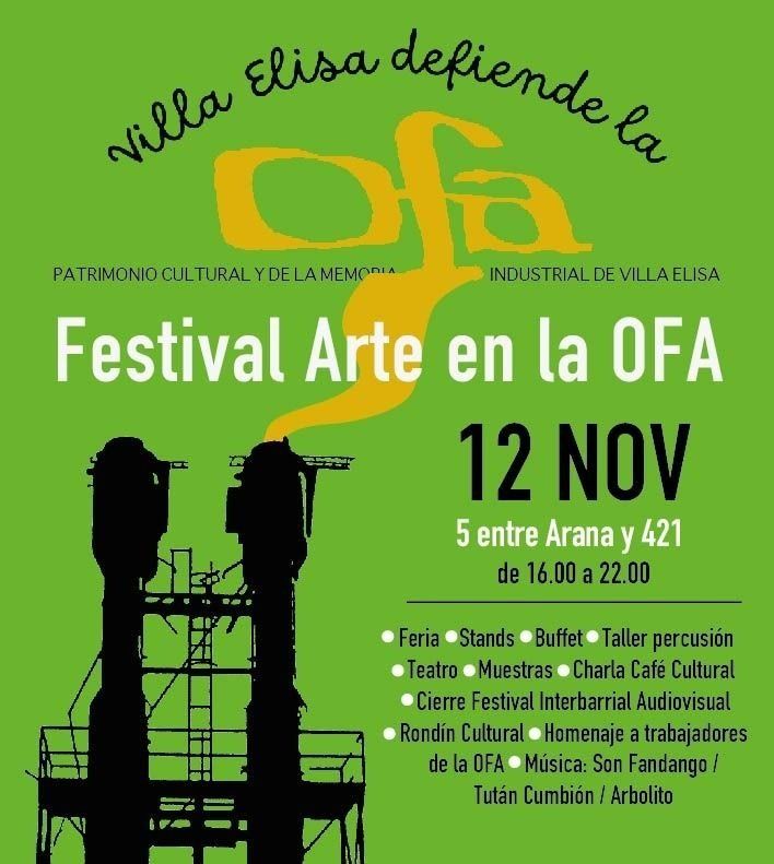 Vecinos de Villa Elisa harán este sábado un Festival Arte en defensa de la Organización Fabril Argentina (OFA), para que el predio se convierta en un espacio comunitario y no en una sede de la Policía Motorizada. El encuentro comenzará desde las 16, en 5 entre Arana y 421.