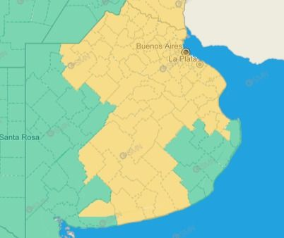 También rige para el conurbano, La Plata y la zona de la bahía de Samborombón. Y más al centro, abarca a los municipios de Olavarría, Azul, Tandil, Tapalqué y 25 de Mayo.