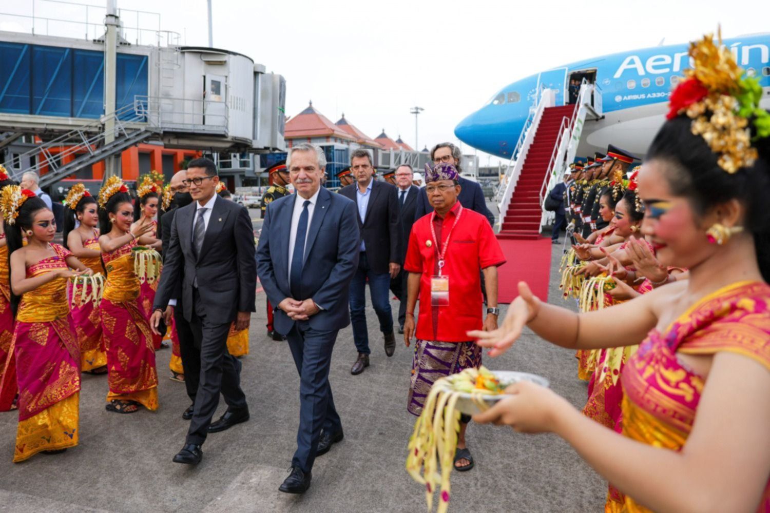 Allí, Fernández fue recibido por el embajador argentino en Indonesia, Gustavo Torres; y con un baile tradicional de jóvenes de Indonesia denominado Tari Pendet.