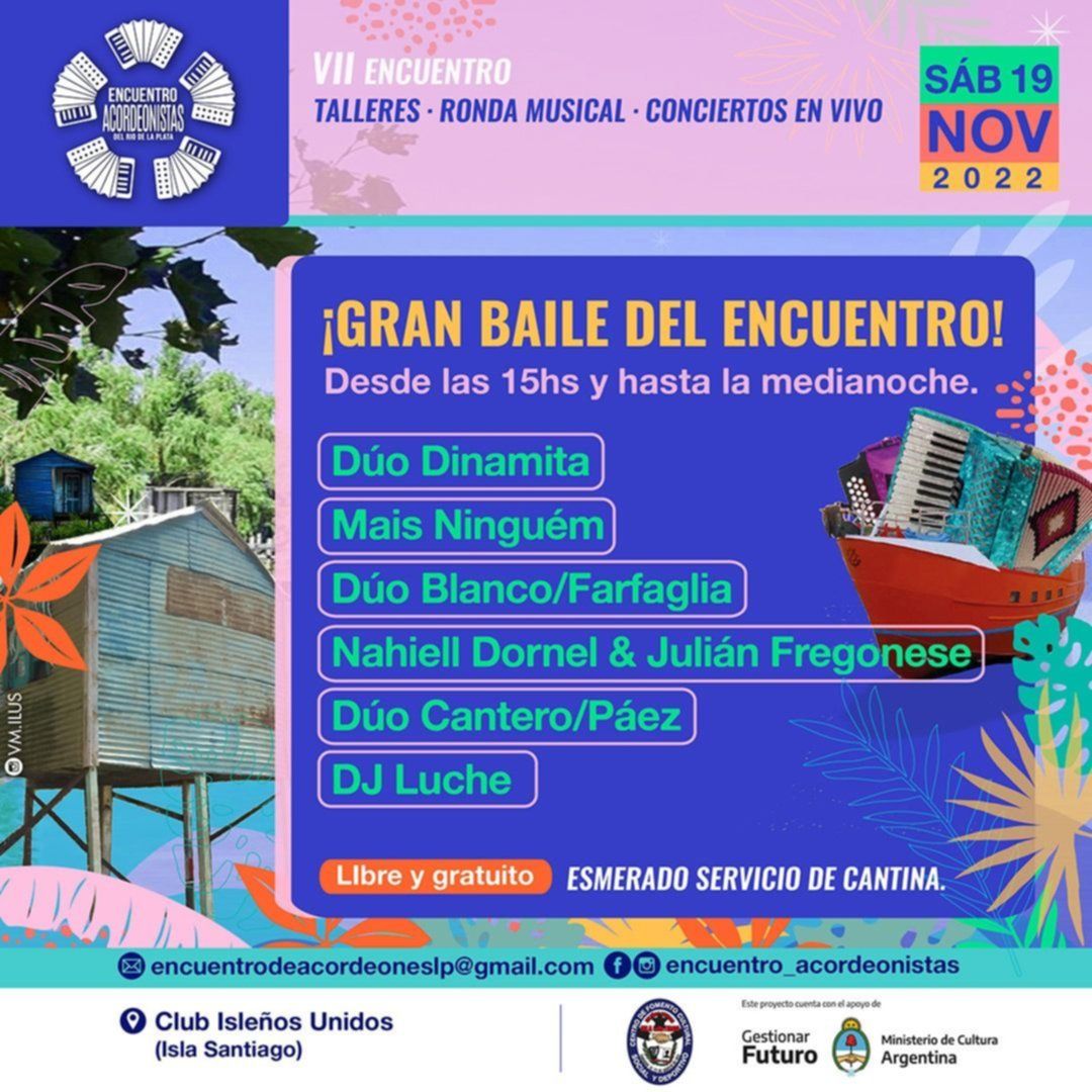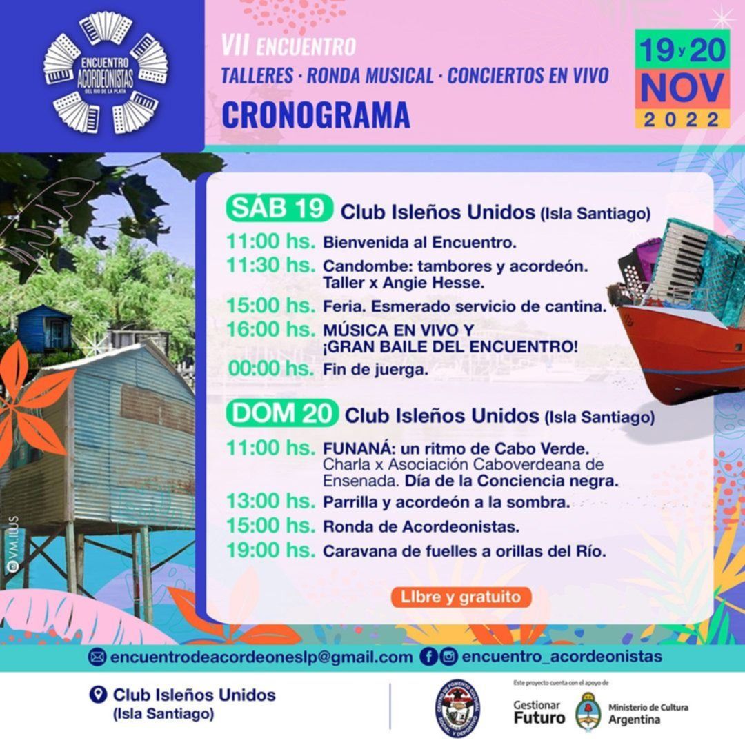 Este sábado 19 y domingo 20 de noviembre se realizará la séptima edición del Encuentro de Acordeonistas del Río de La Plata. En esta ocasión el lugar elegido es el Club Isleños Unidos de Isla Santiago, Ensenada. Habrá talleres, charlas, música en vivo y una ronda de acordeonistas, en este espacio de intercambio de conocimientos y experiencias sobre el instrumento y sus músicas.
