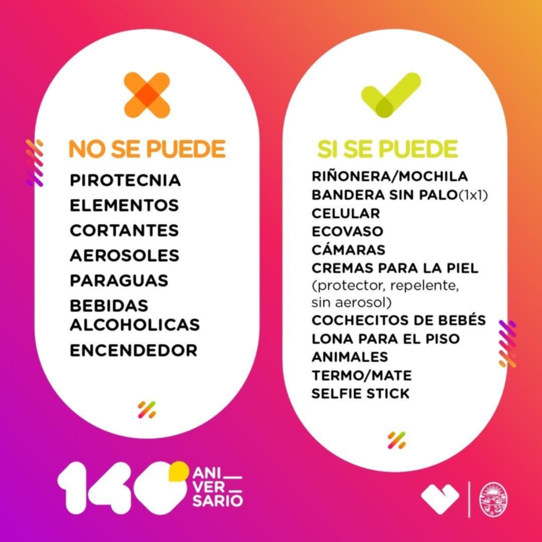 Asimismo, se colocarán controles de acceso al espacio verde en donde personal de seguridad corroborará que los vecinos no ingresen con pirotecnia, elementos cortantes, aerosoles, paraguas, bebidas alcohólicas ni encendedores. Por el contrario, sí estará permitido asistir con animales y portar riñoneras, mochilas, banderas sin palos (de un metro por un metro de máximo), celulares, ecovasos, cámaras fotográficas, cremas para la piel, cochecitos de bebés, lonas para el piso, equipos de mate y selfie sticks.