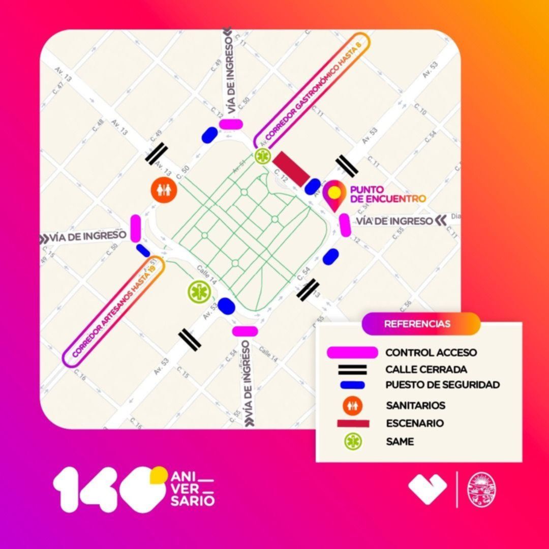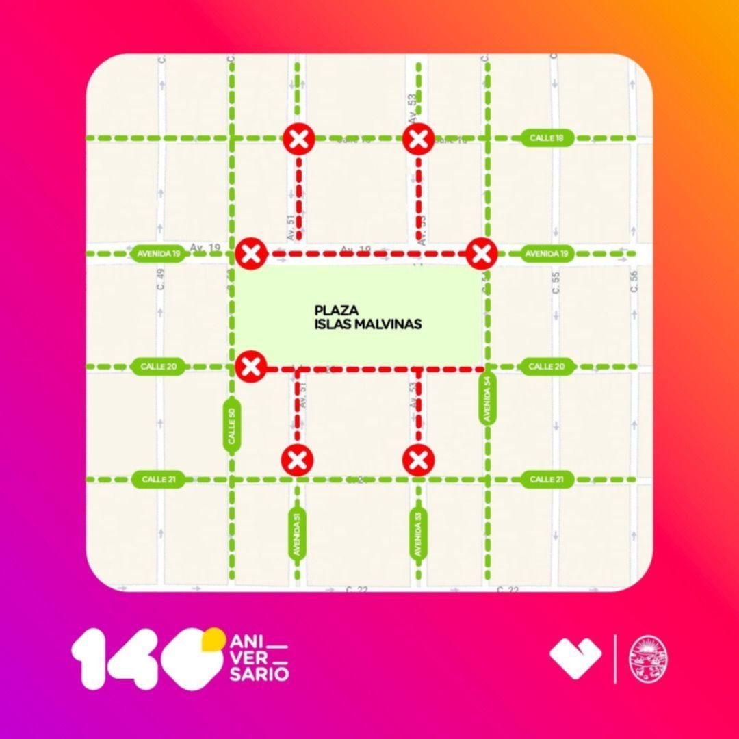 Desde las 9, en tanto, se cortará la avenida 51 entre las calles 8 y 11 para montar el corredor gastronómico, y entre las calles 15 y 19 para que los artesanos locales establezcan sus puestos, quedando libre en ambos casos la circulación en las arterias transversales. Unas horas más tarde, para garantizar el bienestar de todo el público que se acercará a disfrutar de los espectáculos musicales en vivo, personal de Tránsito procederá al corte de los siguientes accesos a la plaza al mediodía: