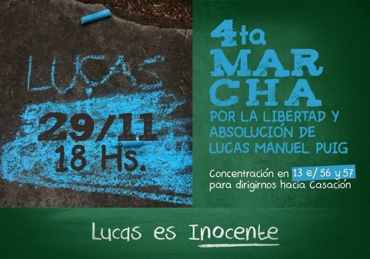 "Continuamos difundiendo la verdad de esta causa y nos manifestamos en estado de lucha permanente para llegar a la justicia. Acercate con carteles pidiendo verdad y justicia, libertad y absolución para Lucas. Sumemos gente, multipliquemos esta lucha", reza la convocatoria prevista para este martes.
