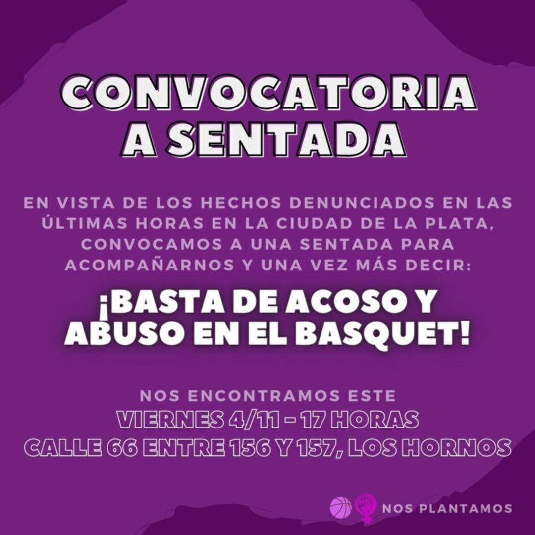 Bajo el lema "¡Basta de acoso y abuso en el básquet!", la movilización servirá para darle todo su apoyo a la víctima y así visibilizar las situaciones que sufren las jóvenes que practican este deporte. "En vista de los hechos denunciados en las últimas horas en la ciudad de La Plata, convocamos a una sentada para acompañarnos", indicaron en la convocatoria que circuló a través de redes sociales y grupos de WhatsApp.