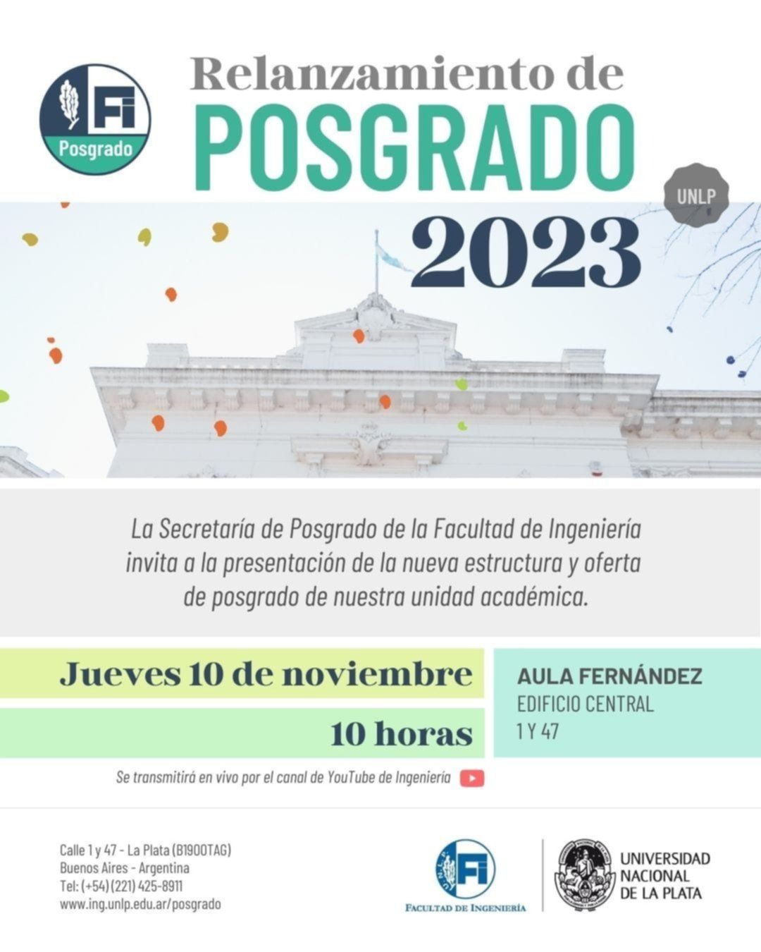 La Facultad de Ingeniería de la UNLP anunció la presentación de la nueva y ampliada oferta de Programas de Posgrado Profesionales y Cursos de Posgrado Profesionales. Será este jueves a las 10 en el Aula Fernández de la unidad académica de 1 y 47.