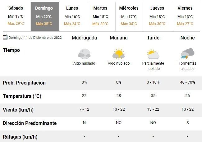 Para el domingo los meteorólogos anticipan una vez más, intenso calor. Los especialistas prevén un día de entre 22 y 35°C, con cielos algo a parcialmente cubiertos y una creciente inestabilidad que podría desatar nuevas lluvias y tormentas en horas de la noche.