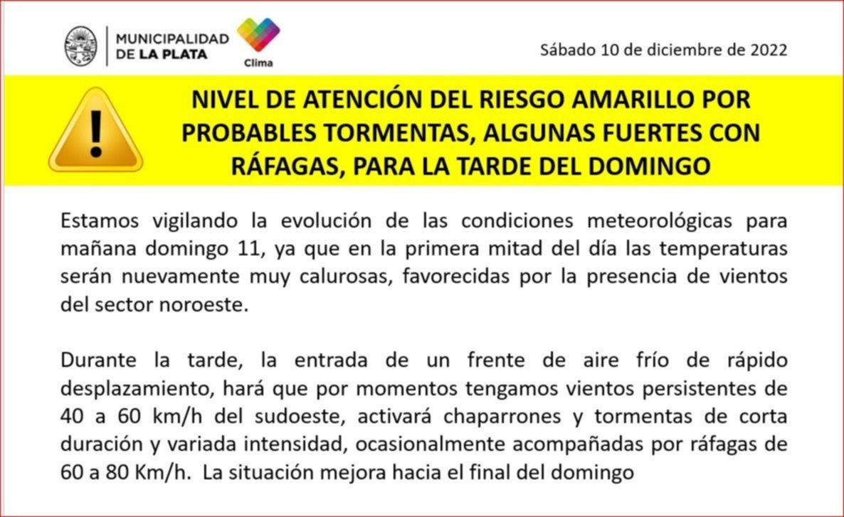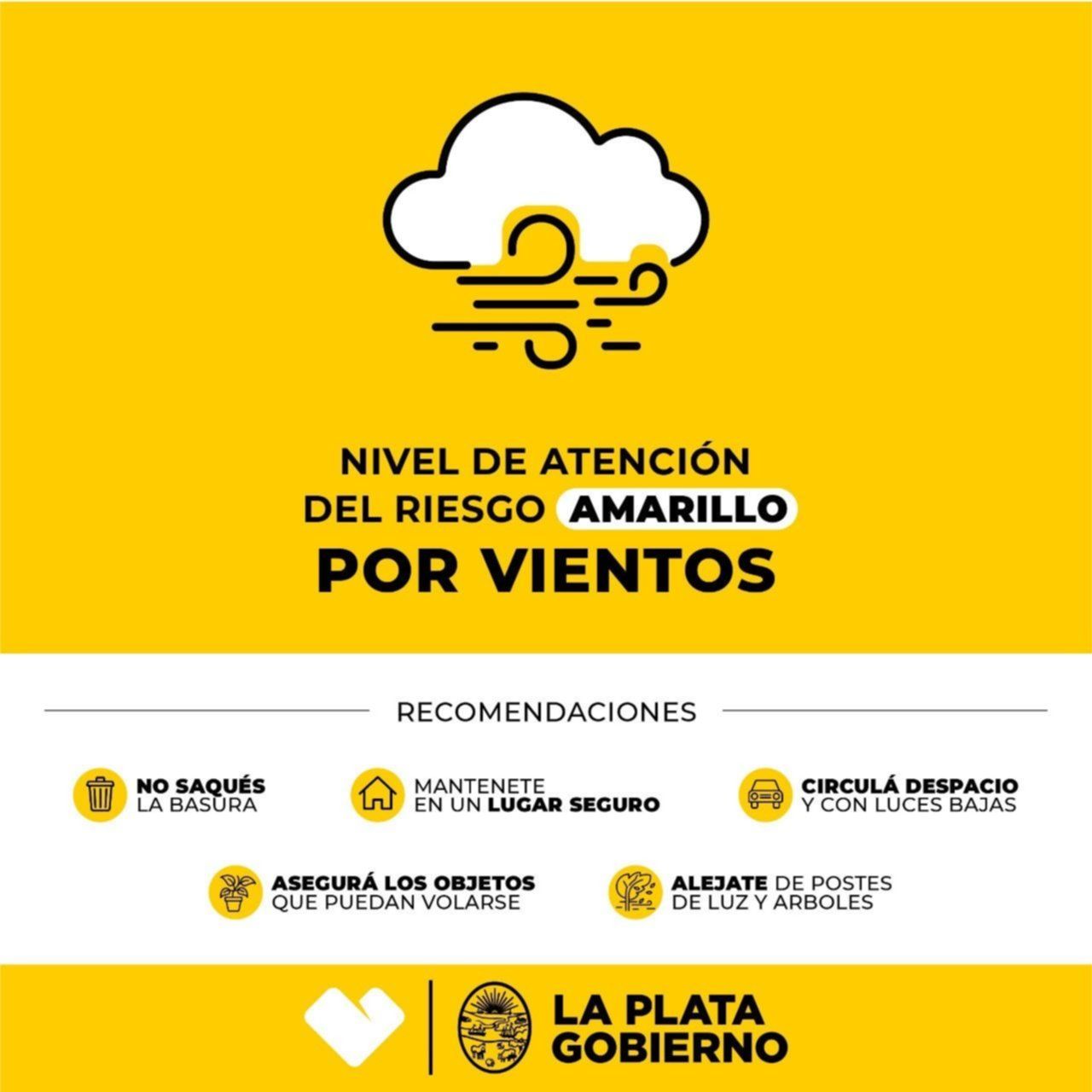 La Municipalidad de La Plata estableció el Nivel de Atención del Riesgo (NAR) "Amarillo" por tormentas y ráfagas de viento para este domingo y por eso se emitieron una serie de recomendaciones a la población.