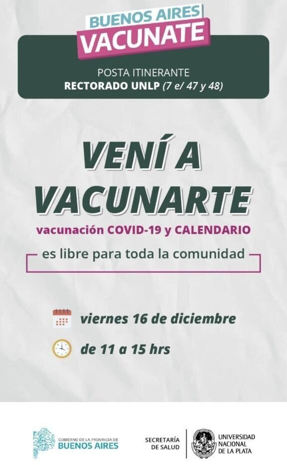 La UNLP anunció que este viernes se instalará en una posta itinerante de vacunación contra el COVID-19 y dosis de calendario en el patio del edificio del Rectorado, en 7 entre 47 y 48.