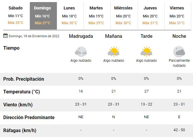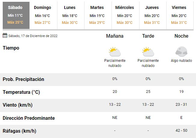 Los expertos argentinos prevén unos 25°C de temperatura máxima para el sábado y otros 27°C para el domingo, acompañados de mucho con sol y muy buenas condiciones climáticas tanto en la ciudad como en el resto de la región. Así, el fin de semana transcurrirá sin mayores contratiempos, con poca humedad y algo ventoso, incluso con ráfagas de entre 42 y 50 km/h.