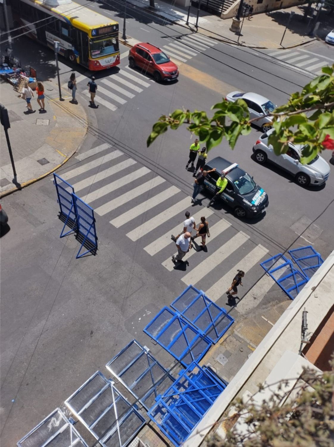 El Ministerio de Seguridad bonaerense comenzó a disponer las vallas celestes este sábado con el objetivo de proteger tanto el edificio ubicado en esa esquina, como los negocios de la zona y el puesto de diarios y revistas que sufrieron parte de los daños ocasionados por los hinchas.