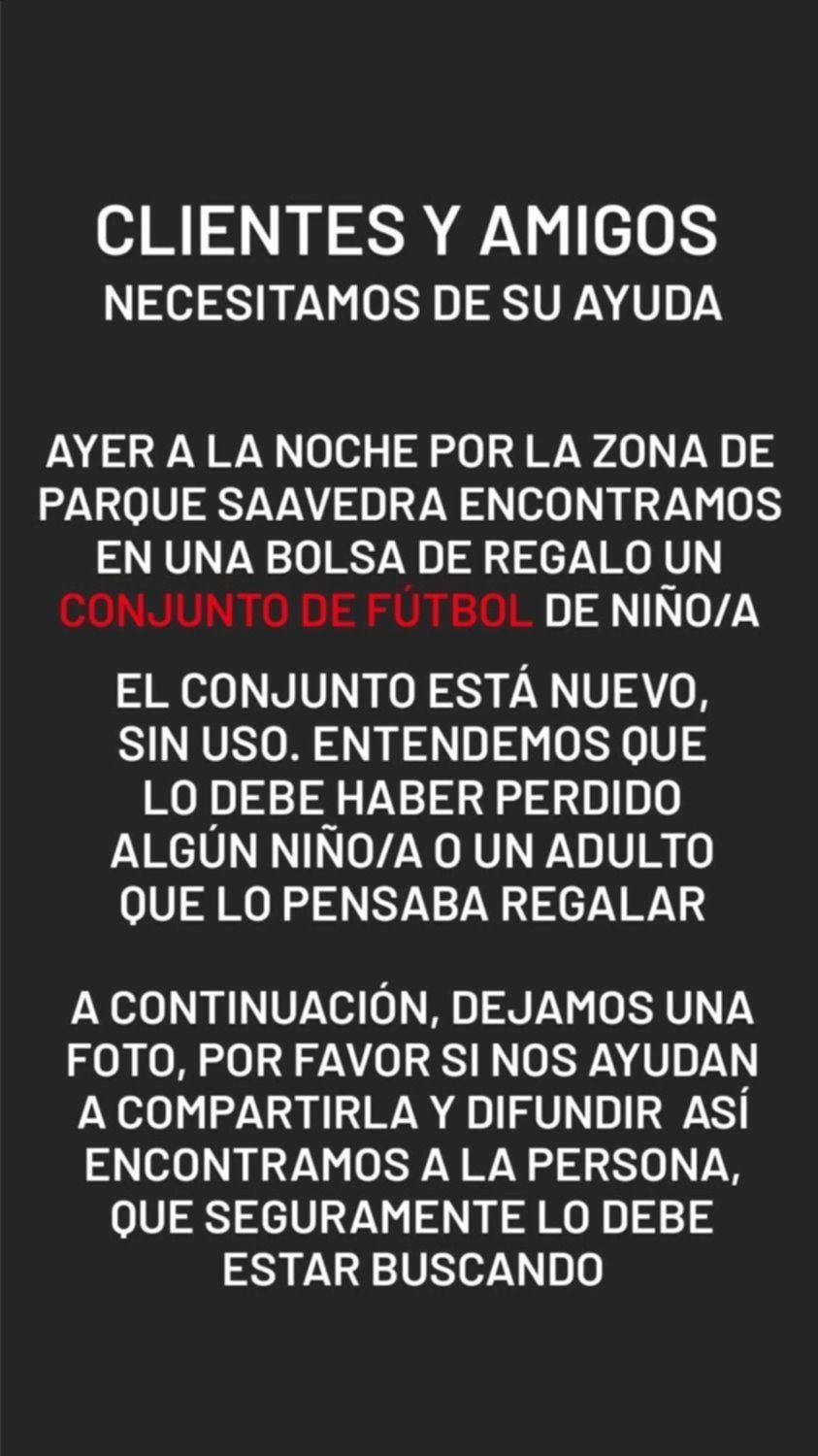 La iniciativa se publicó en la historias de la cuenta de El Garage Antiques, una tienda de muebles de estilo y antigüedades. "Buscamos al niño que perdió este conjunto de fútbol", dice el mensaje que acompaña la foto.