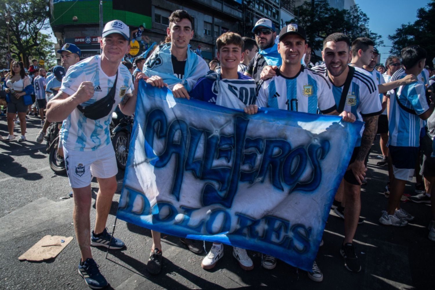 Cientos de miles de hinchas tiñen de celeste y blanco desde esta mañana la zona del Obelisco, en el centro porteño, algunos con réplicas de la Copa y en un clima de algarabía, a la espera del micro que trasladará hasta allí a la Selección campeona del mundo que llegó al país durante la madrugada de este martes en un vuelo de Aerolíneas Argentinas, para celebrar el tercer título de la historia obtenido en el Mundial de Qatar. Engalanados con camisetas argentinas, algunas de ellas intervenidas manualmente con la tercera estrella, y con la ilusión de llegar lo más cerca posible de los jugadores, saltan y cantan, mientras un hormiguero humano comienza a colmar las laterales de la avenida 9 de Julio.