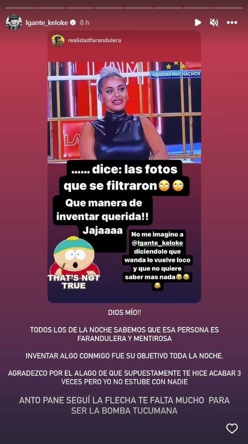 En la noche del martes la joven fue invitada a participar del programa LAM, reveló supuestos intercambios de mensajes con el músico y confesó haber pasado una fogosa noche juntos. L-Gante, sin embargo, no se quedó callado y le salió rápidamente al cruce: "¡Dios mío! Todos los de la noche sabemos que esa persona es farandulera y mentirosa. Inventar algo conmigo fue su objetivo toda la noche", arremetió.