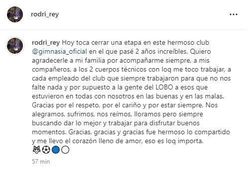 "Hoy toca cerrar una etapa en este hermoso club @gimnasia_oficial en el que pasé 2 años increíbles", indicó a través de Instagram. En esa línea, agregó: "Quiero agradecerle a mi familia por acompañarme siempre, a mis compañeros, a los dos cuerpos técnicos con los que me tocó trabajar, a cada empleado del club que siempre trabajaron para que no nos falte nada y por supuesto a la gente del Lobo a esos que estuvieron en todas con nosotros en las buenas y en las malas".