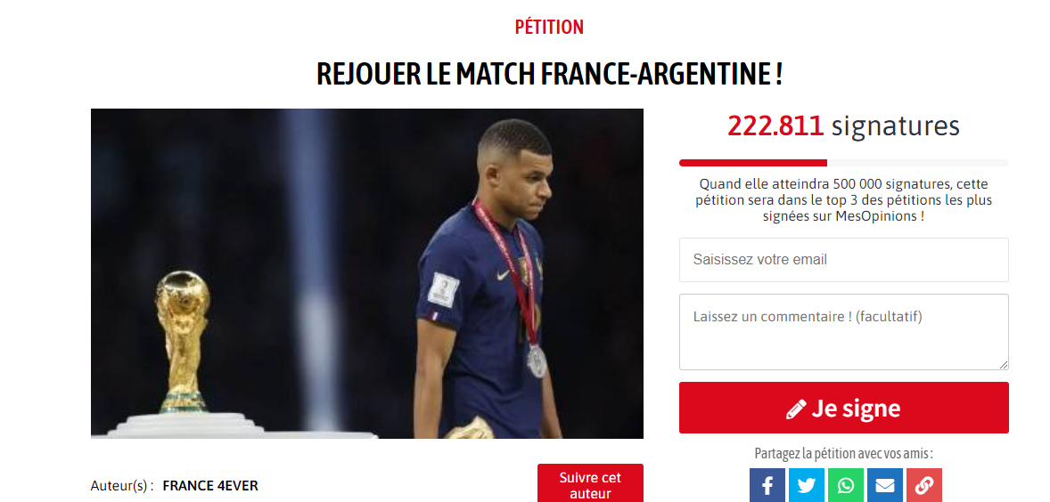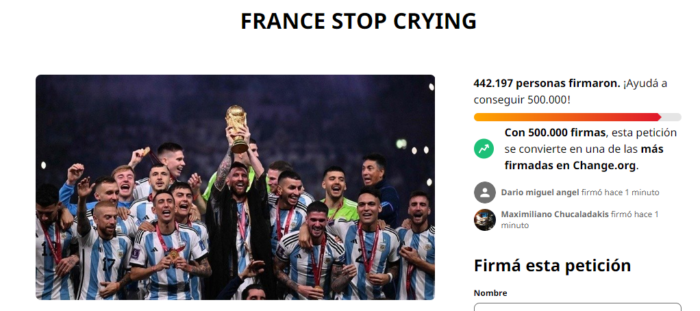 En respuesta a la petición de los franceses para que la final del Mundial de Qatar 2022 se vuelva a jugar a causa de los supuestos errores arbitrales, en Argentina se creó una para que "Francia deje de llorar", y en pocas horas ya se juntaron más firmas que la primera.
