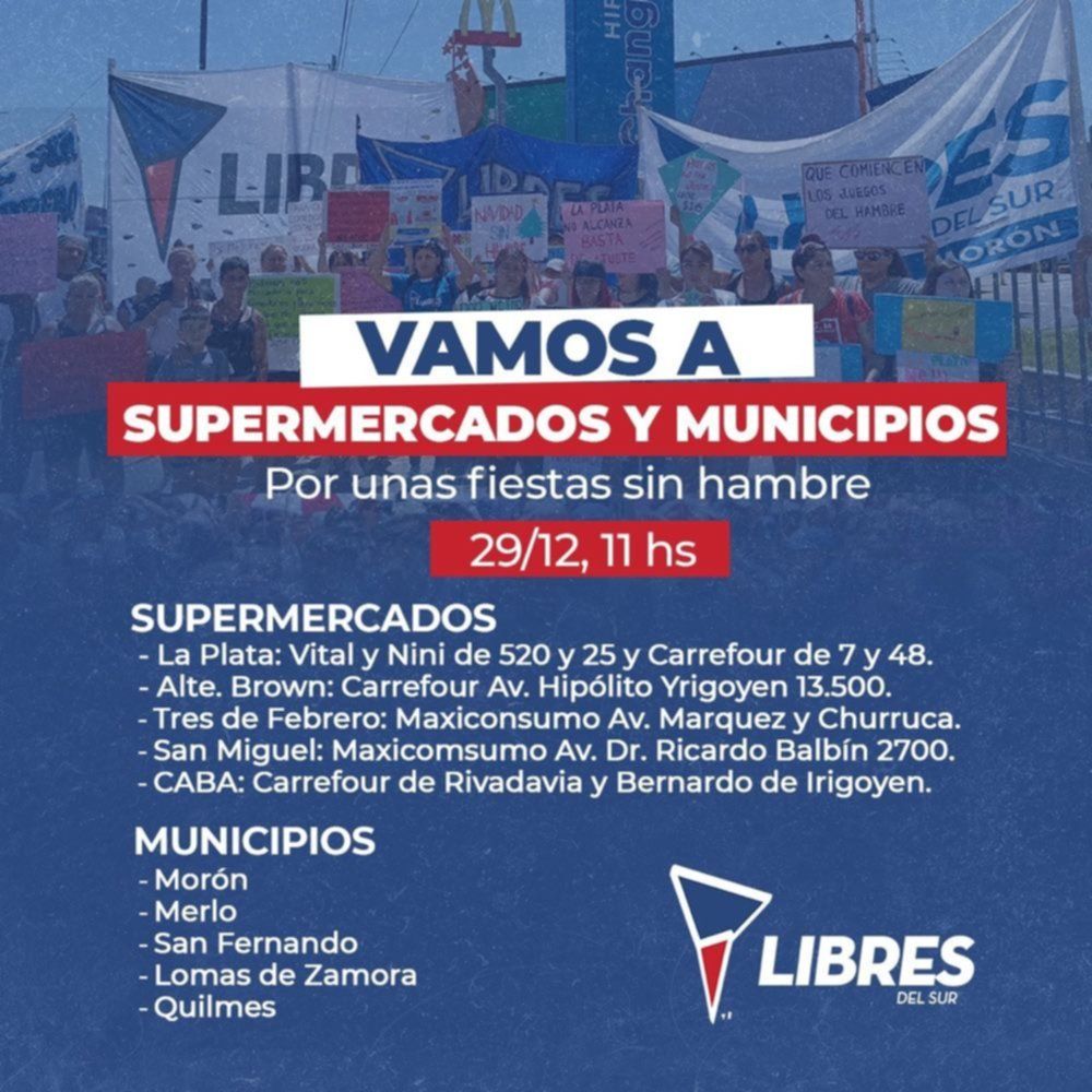 La organización social que lideran Silvia Saravia y Jesús Escobar llevará adelante una jornada de protesta en la Ciudad Autónoma de Buenos Aires (CABA) y en distintos municipios del Área Metropolitana de Buenos Aires (AMBA), como La Plata; para pedir a las autoridades locales y provinciales y los empresarios de las cadenas alimenticias una ayuda en términos de mercadería para poder terminar el año "con dignidad".