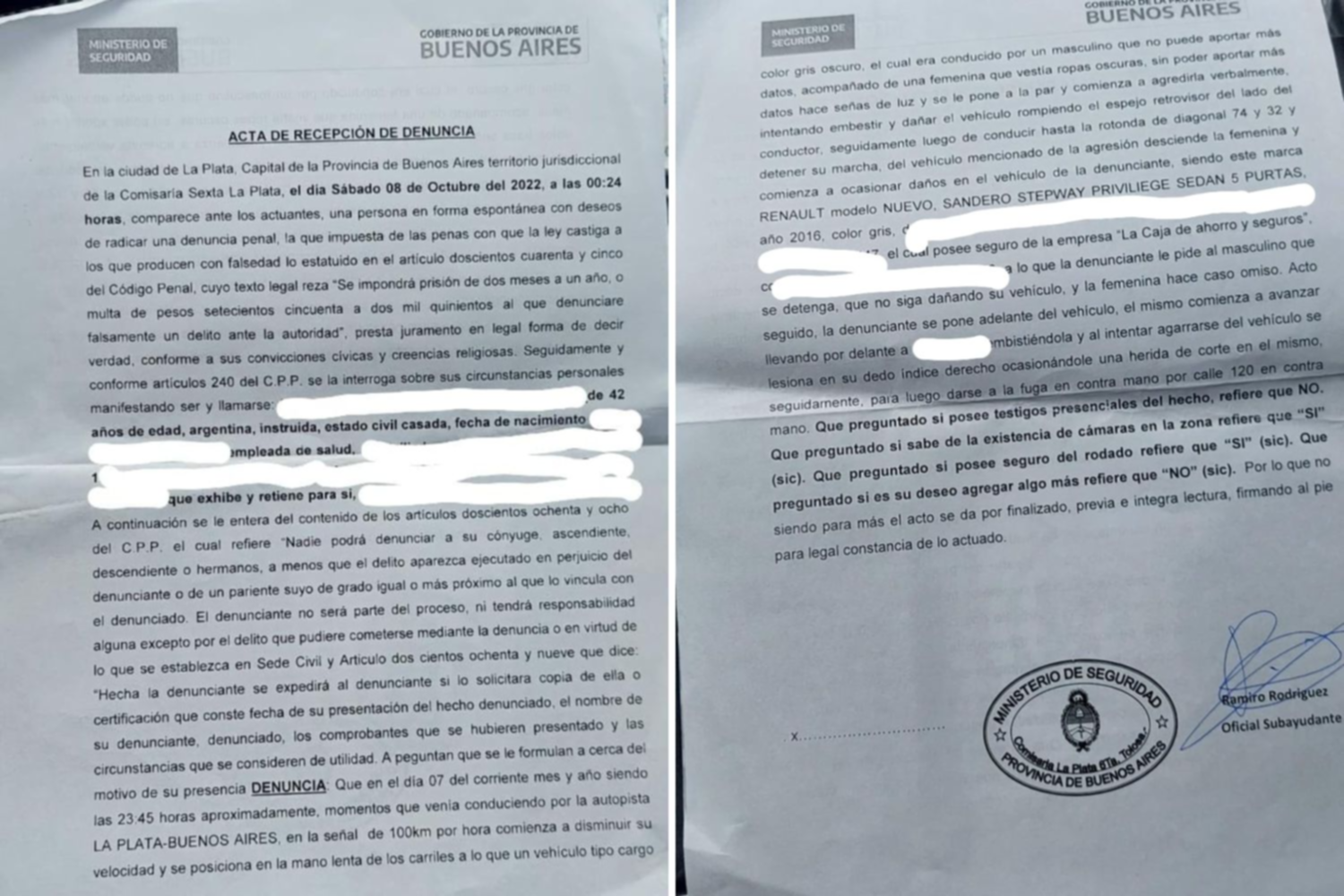 La noche del viernes 7 de octubre, P. (42) manejaba desde Villa Elisa hasta La Plata por la Autopista cuando notó que un automóvil gris la seguía muy pegado y le hacía luces. Ella venía pensando en la jornada nocturna de trabajo que le esperaba, con dos decenas de pacientes de cuidados paliativos en el hospital San Martín de la capital provincial. Pero intentó descender la marcha y correrse al carril derecho para no ofuscar al conductor de atrás. "Se me pegó tanto que no podía disminuir la marcha ni correrme, y cuando llegamos a los carteles de velocidad decía 100 de máxima. Empecé a bajar, pero el auto seguía haciéndome luces desde atrás, como si tuviera la rueda pinchada o algo así" cuenta, semanas más tarde, a 0221.com.ar.