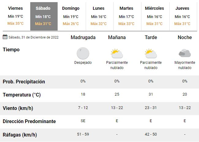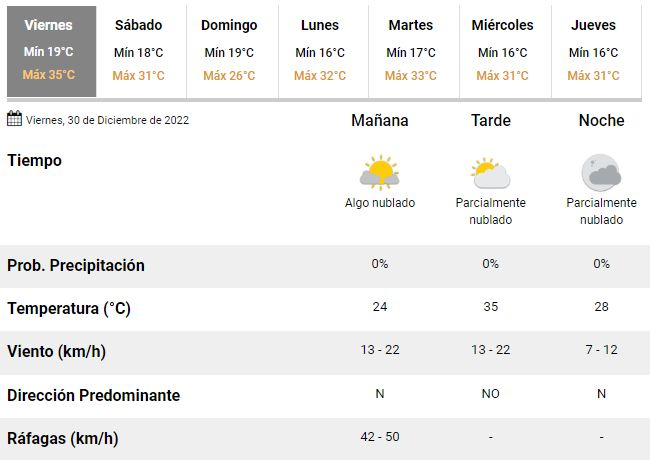 Los meteorólogos también esperan un día con cielo despejado, poca humedad y vientos leves a moderados soplando desde el norte, pudiendo registrarse algunas fuertes ráfagas de viento en horas de la mañana. De esta manera la última semana del año se despide con una jornada en la que habrá que mantenerse hidratado y en alerta para evitar los golpes de calor, sobre todo en los más chicos y los adultos mayores.