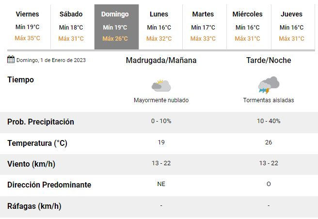 El 2023, por su parte, comenzaría inestable. Para el domingo los expertos prevén la posibilidad de algunas tormentas aisladas hacia la tarde y vientos de entre 13 y 22 km/h, acompañados de un marcado descenso de la temperatura que oscilaría entre 19 y 26°C.