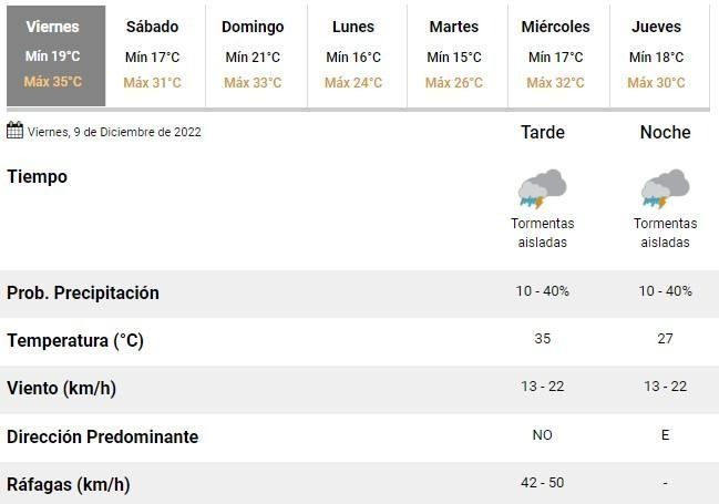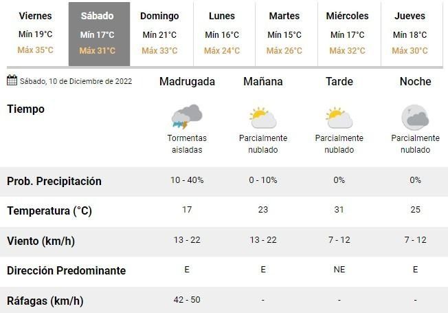 La inestabilidad, según se prevé, se mantendrá hasta el arranque del fin de semana y es que los meteorólogos argentinos pronostican más tormentas aisladas durante las primeras horas del sábado, que finalmente cerrará con un cielo parcialmente nublado y una calurosa máxima de 31°C.