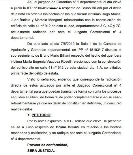 En tanto Billiani tiene otra causa elevada a juicio que está radicada en el Juzgado Correccional 4 de La Plata. El fiscal solicitó en el pedido de juicio que se unifiquen allí ambas causas "de forma tal de poder complementarse y -en su caso retroalimentarse ya que no dejan de constituir, en definitiva, un concurso real de delitos".