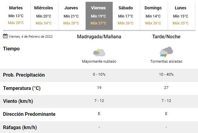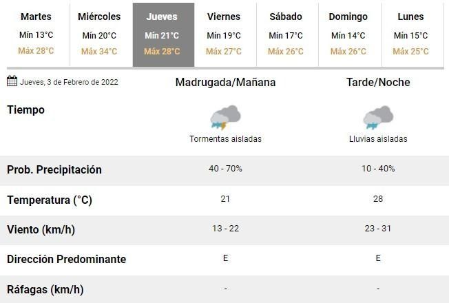Los expertos prevén temperaturas de entre 21 y 28°C primero y 19 a 27°C durante el último día de la semana, acompañadas de lluvias y tormentas aisladas. La inestabilidad continuaría durante el fin de semana y aunque las probabilidades de nuevas precipitaciones serán escasas, en el SMN no descartan algunos chaparrones aislados.