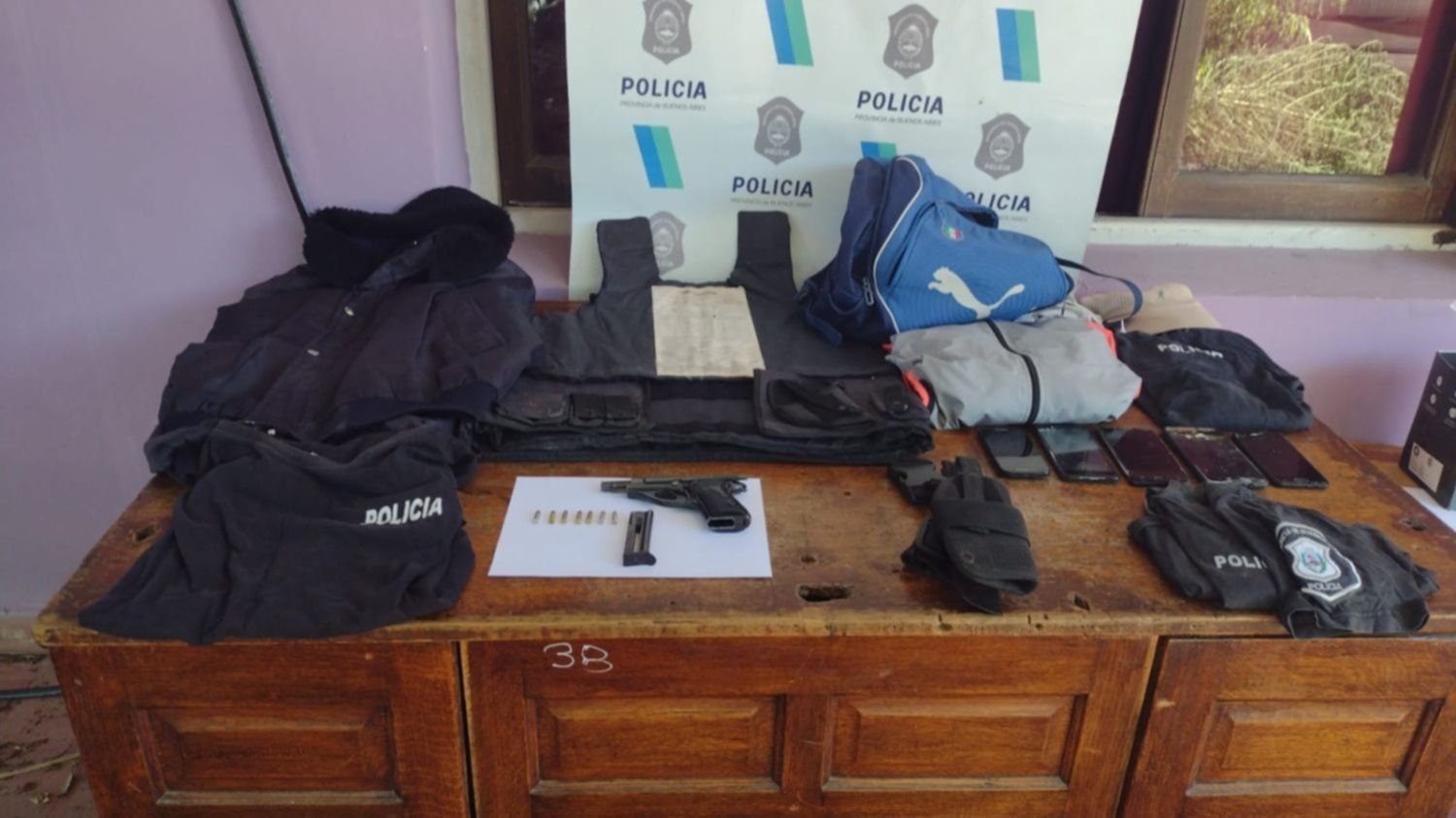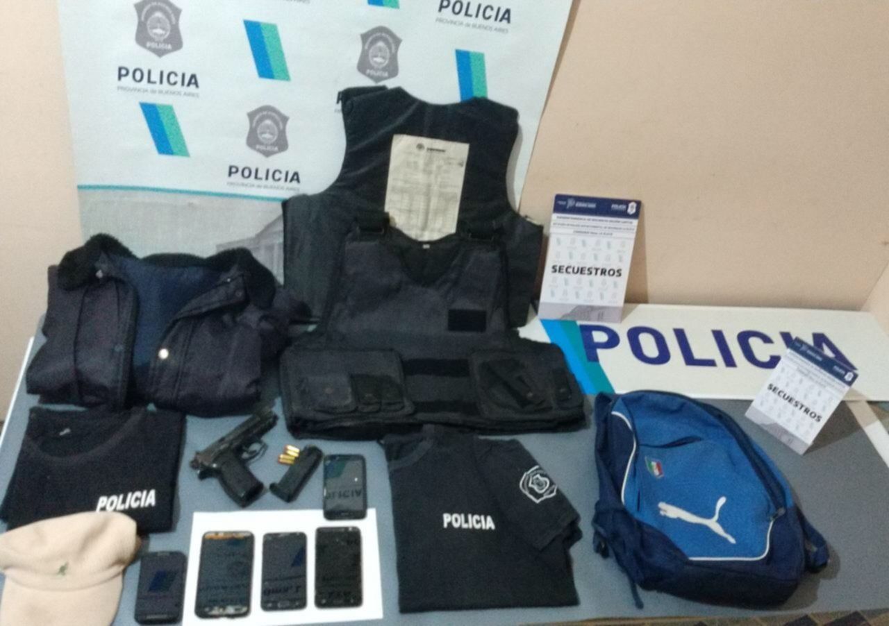 El delincuente fue arrestado en un domicilio de 441 entre 28 y 29 por oficiales de la comisaría Décima, quienes incautaron un arma de fuego calibre 22 marca Bersa con municiones, un chaleco antibalas color azul similar al de las fuerzas de seguridad, dos remeras negras con la inscripción de "Policía", una campera azul y demás elementos de interés para la causa.
