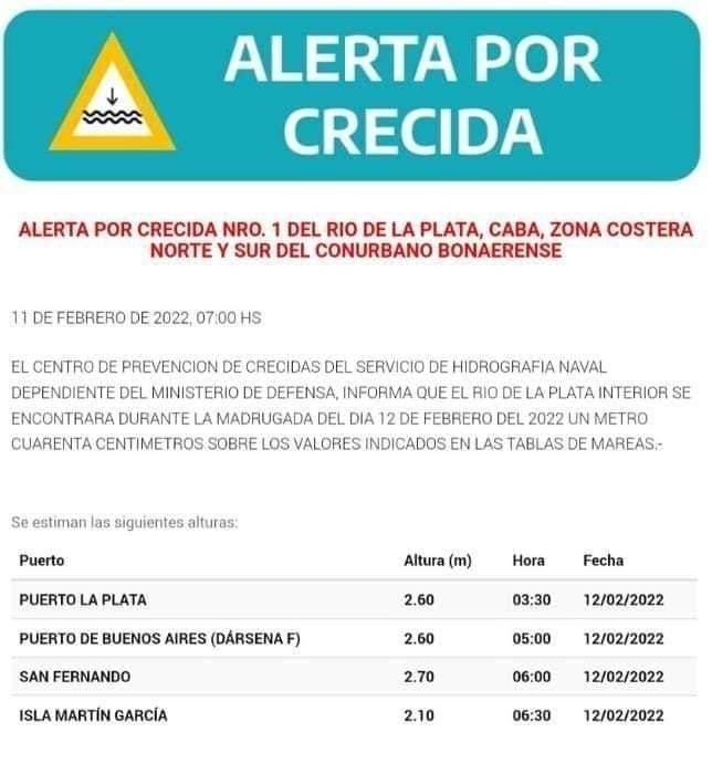 El Centro de Prevención de Crecidas del Servicio de Hidrografía Naval dio a conocer que el nivel del río estará un metro cuarenta centímetros sobre los valores indicados y habituales.