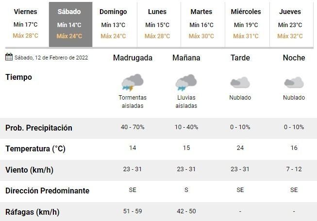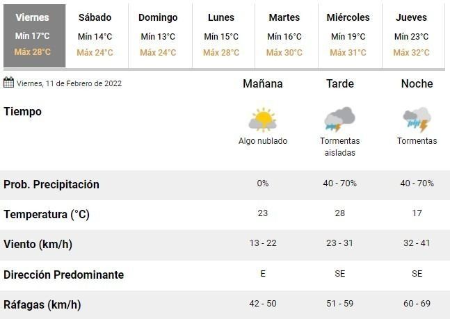 Los especialistas del SMN indicaron que la jornada transcurrirá sin contratiempos al menos hasta pasado el mediodía y prevén una máxima en torno a los 28°C. La intensidad del viento, sin embargo, se mantendrá a lo largo de toda la jornada, soplando a velocidades constantes de entre 13 y 41 km/h y pudiendo alcanzar ráfagas de hasta 69 km/h.