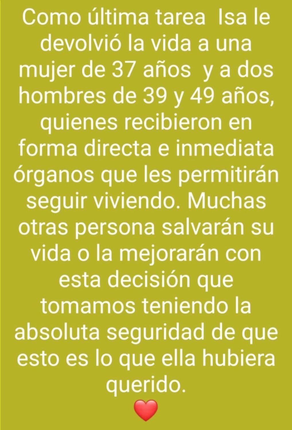 La joven fue trasladada de urgencia e internada en el hospital Larrain de Berisso, pero los profesionales no pudieron hacer nada para salvarla y le diagnosticaron "muerte cerebral". Horas después de lo sucedido Jones confirmó a través de sus redes sociales que los órganos de Isabella fueron donados y sirvieron para salvarle la vida a al menos tres personas, una mujer de 37 años y dos hombres de 39 y 49.