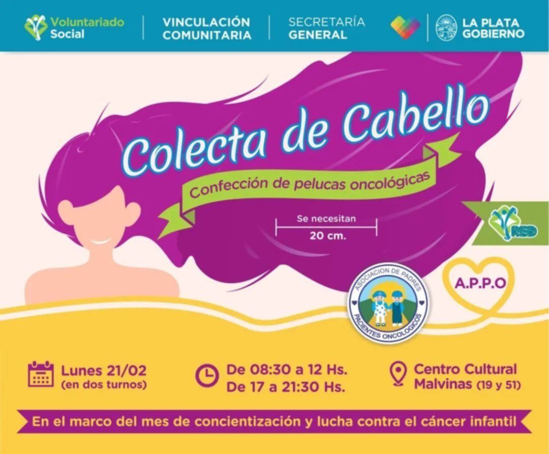 La Dirección de Voluntariado Social de la Municipalidad reeditará la colecta anual de cabello con el objetivo de hacer pelucas para pacientes oncológicos de toda la región. La jornada, que se realizará en conjunto con la Asociación de Padres de Pacientes Oncológicos (APPO), tendrá lugar el próximo lunes 21 en el Centro Cultural Malvinas, ubicado en 19 y 51; en dos turnos de 8.30 a 12 y de 17 a 21.30.