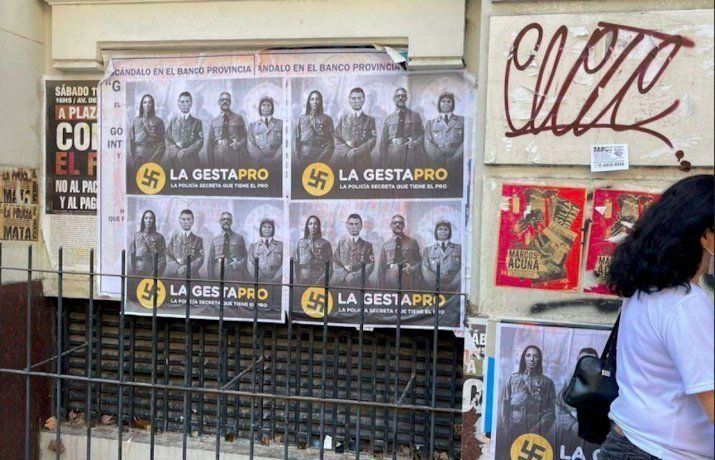Los carteles además mostraban una esvástica con la frase “la GESTAPRO. La policía secreta que tiene le PRO”, haciendo referencia a la causa “Gestapo antisindical” que investiga las escuchas del gobierno macrista. El caso surgió luego de la aparición del video de 2017 de Villegas con empresarios y efectivos de la Agencia Federal de Inteligencia, donde el exfuncionario afirma que le hubiese gustado tener una Gestapo “para terminar con los gremios”.