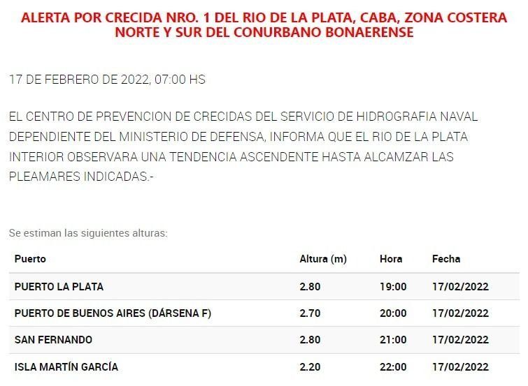 Los especialistas indicaron que en el Puerto La Plata la altura llegará a los 2,80 metros, mientras que en el Puerto de Buenos Aires será también de 2,70 metros, en San Fernando de 2,80 y en la Isla Martín García de 2,20.