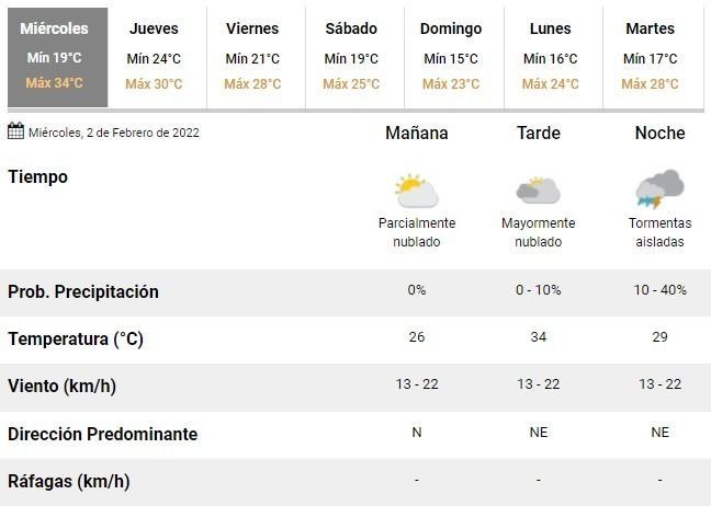 El miércoles comenzó con un clima excelente, una temperatura mínima rondando los 19°C y un cielo completamente despejado, como antesala de una tarde de mucho calor y una máxima prevista en torno a los 34°C. Los expertos prevén una jornada con buen tiempo y nubosidad variable que, no obstante, cerrará con cierta inestabilidad.