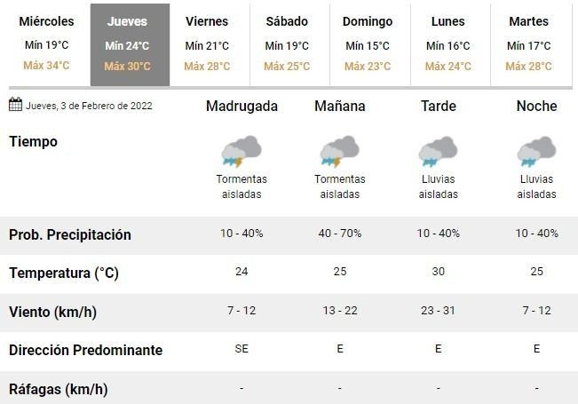 Los meteorólogos argentinos prevén un jueves con una temperatura de entre 24 y 30°C, acompañada de tormentas durante las primeras horas del día y lluvias aisladas pasadas las 12. Las malas condiciones del tiempo perdurán durante toda la jornada e incluso se extenderán hasta el viernes.