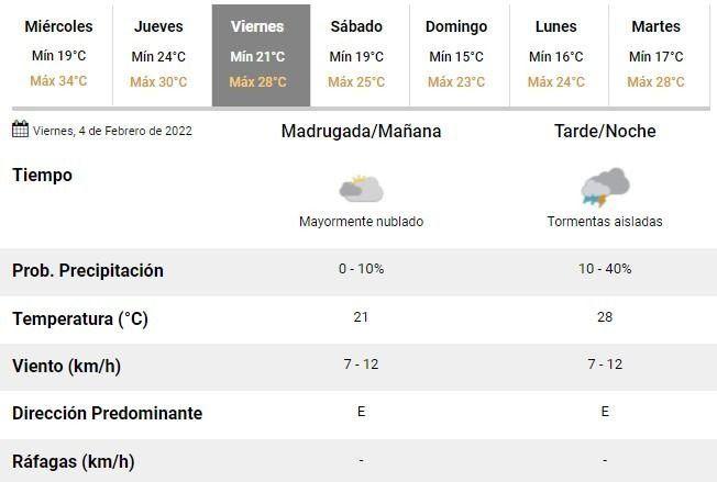 Para el último día de la semana se espera, en tanto, una mañana gris y con cielo mayormente cubierto, como previa de una tarde con ciertas probabilidades de lluvias y tormentas.