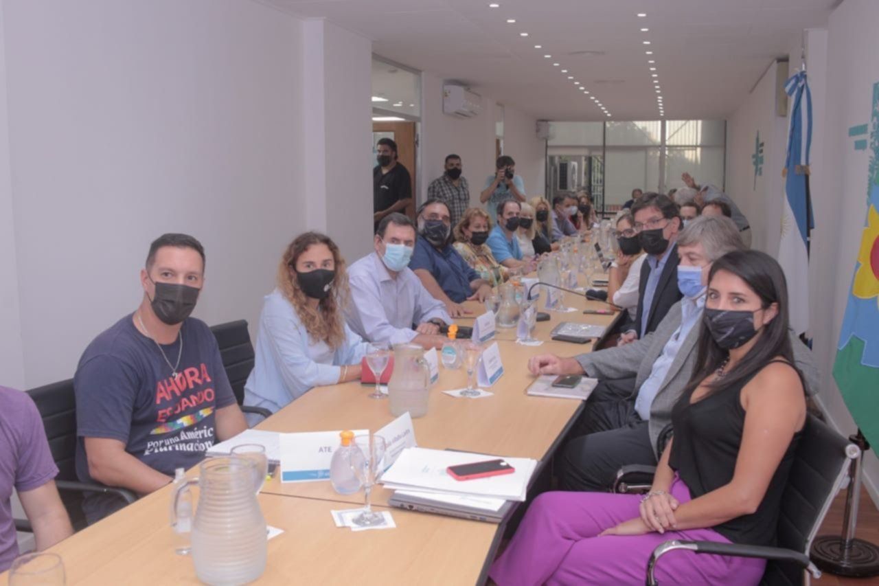 El director general de Cultura y Educación bonaerense, Alberto Sileoni, y los ministros de Hacienda, Pablo López, y de Trabajo, Mara Ruiz Malec, mantuvieron un encuentro con los representantes del Frente de Unidad Docente Bonaerense (FUDB), que ahora analizará la propuesta que contempla un incremento del 17% en marzo y del 28% en julio, lo que alcanza una suba en septiembre, con respecto a diciembre de 2021, del 41,8%.