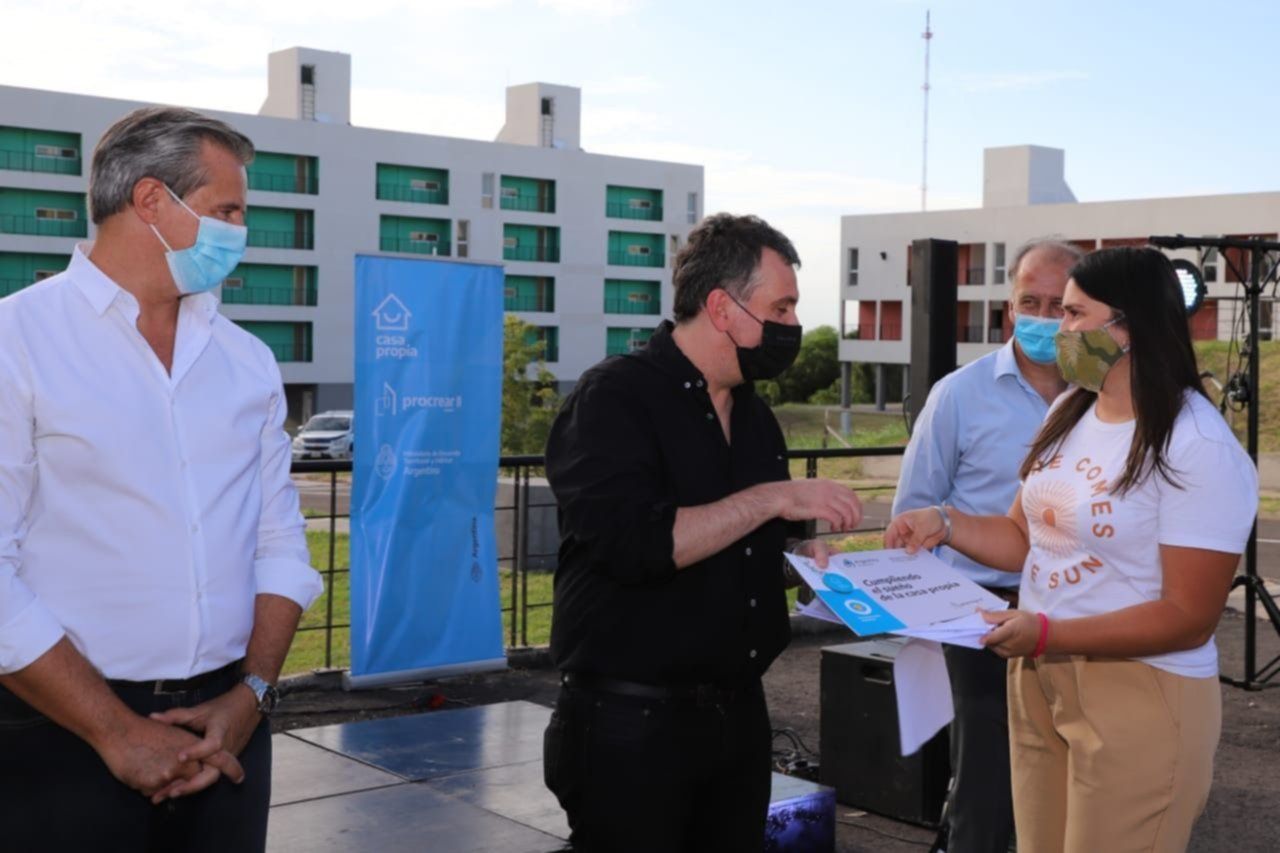 En continuidad con las acciones que el Gobierno Nacional viene llevando adelante a través del Ministerio de Desarrollo Territorial y Hábitat, en la ciudad de Santa Fe el subsecretario de Política de Suelo y Desarrollos Habitacionales, Juan Pablo Negro, acompañado por la ministra de Infraestructura, Servicios Públicos y Hábitat de la provincia homónima, Silvina Frana, y por el secretario de Hábitat, Urbanismo y Vivienda provincial, Amado Zorzón, entregó llaves del Desarrollo Urbanístico Estación Cambios ubicado en la ciudad capital, que fue construido a través de Procrear II. Además, se otorgaron créditos para que más familias puedan edificar sus nuevos hogares.